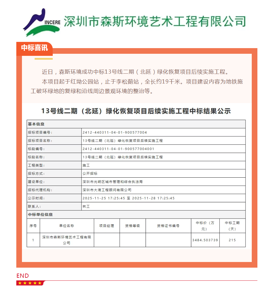 中标喜讯 | 森斯环境中标13号线二期(北延)绿化恢复项目后续实施工程