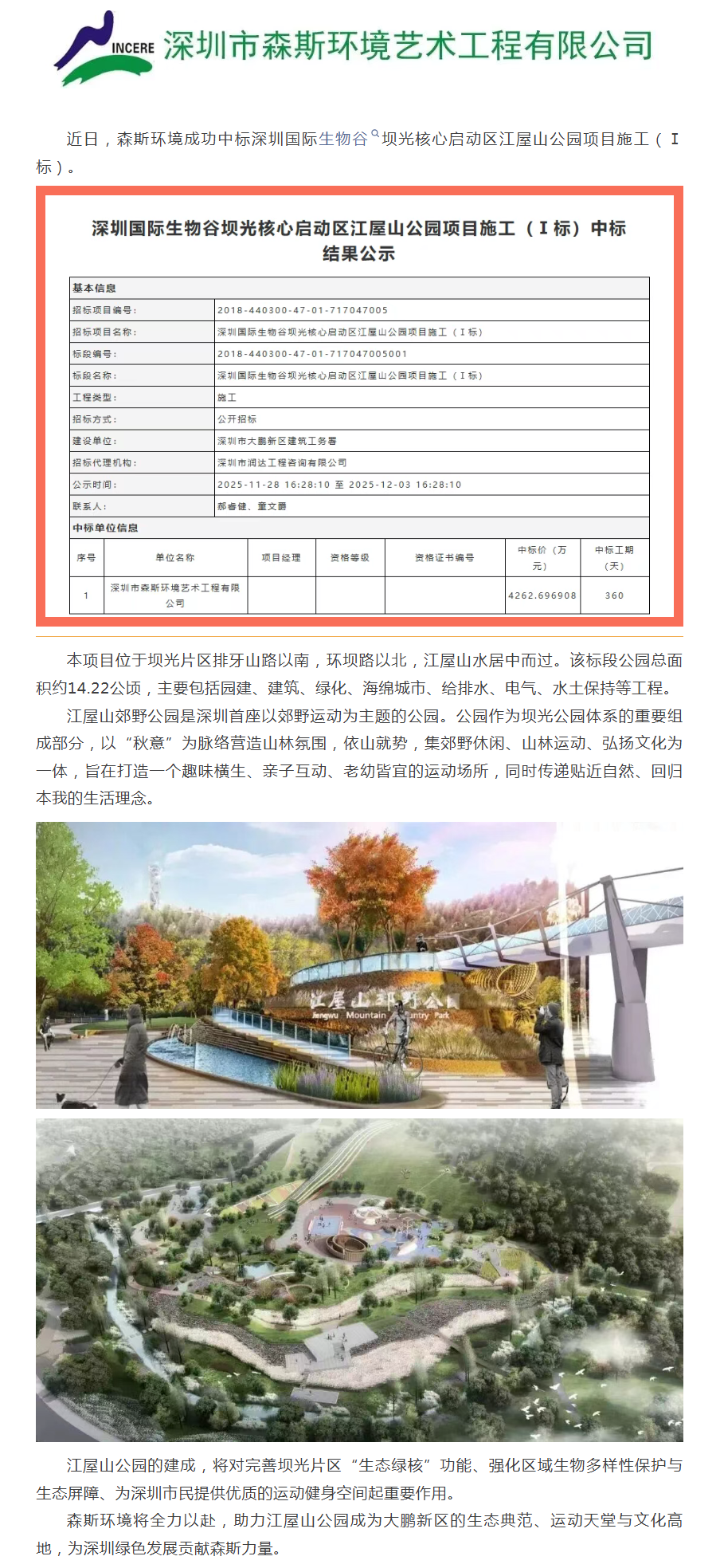 中标喜讯 | 森斯环境中标深圳国际生物谷坝光核心启动区江屋山公园项目施工(Ⅰ标)