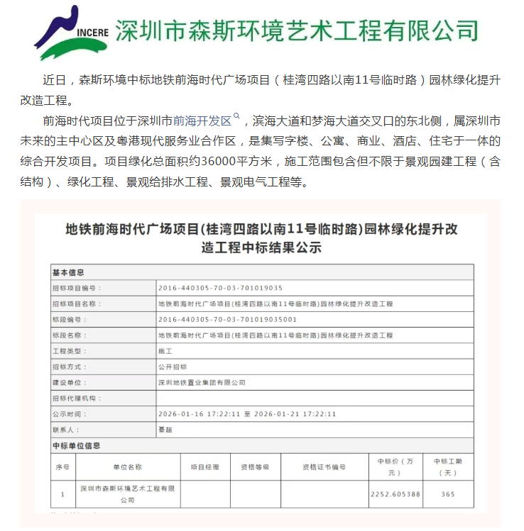 中标喜讯 | 森斯环境中标地铁前海时代广场项目(桂湾四路以南11号临时路)园林绿化提升改造工程