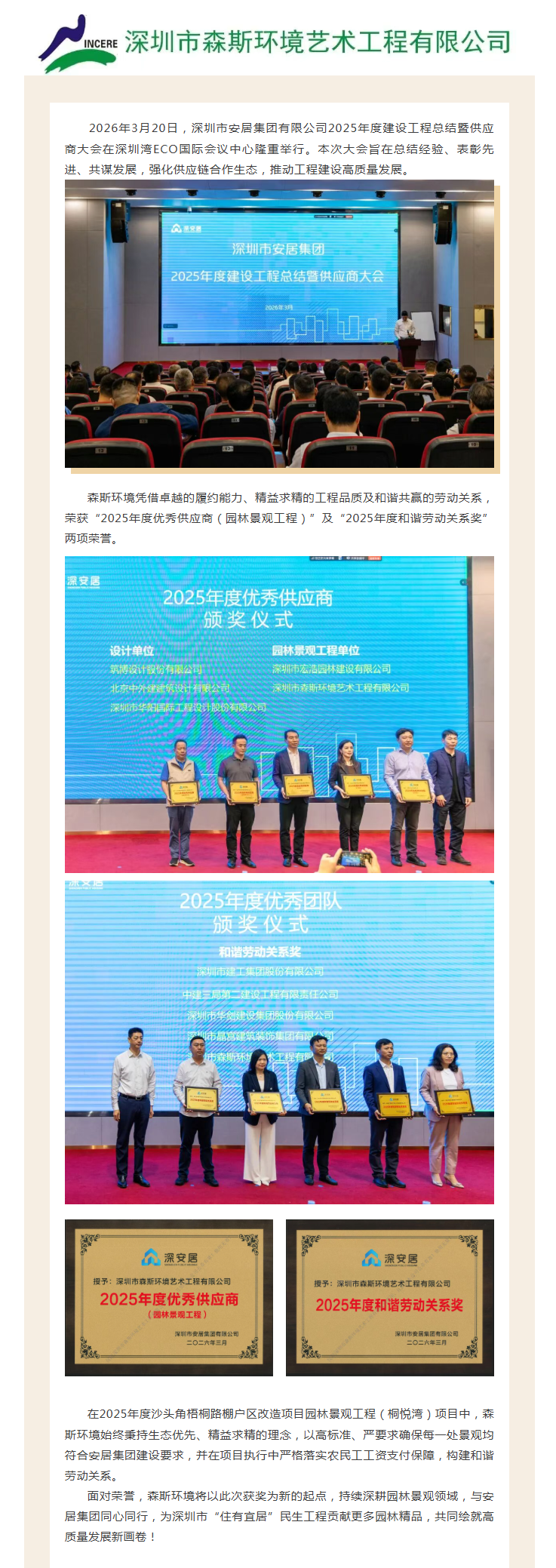 森斯环境荣获深圳市安居集团有限公司2025年度优秀供应商(园林景观工程)、和谐劳动关系奖